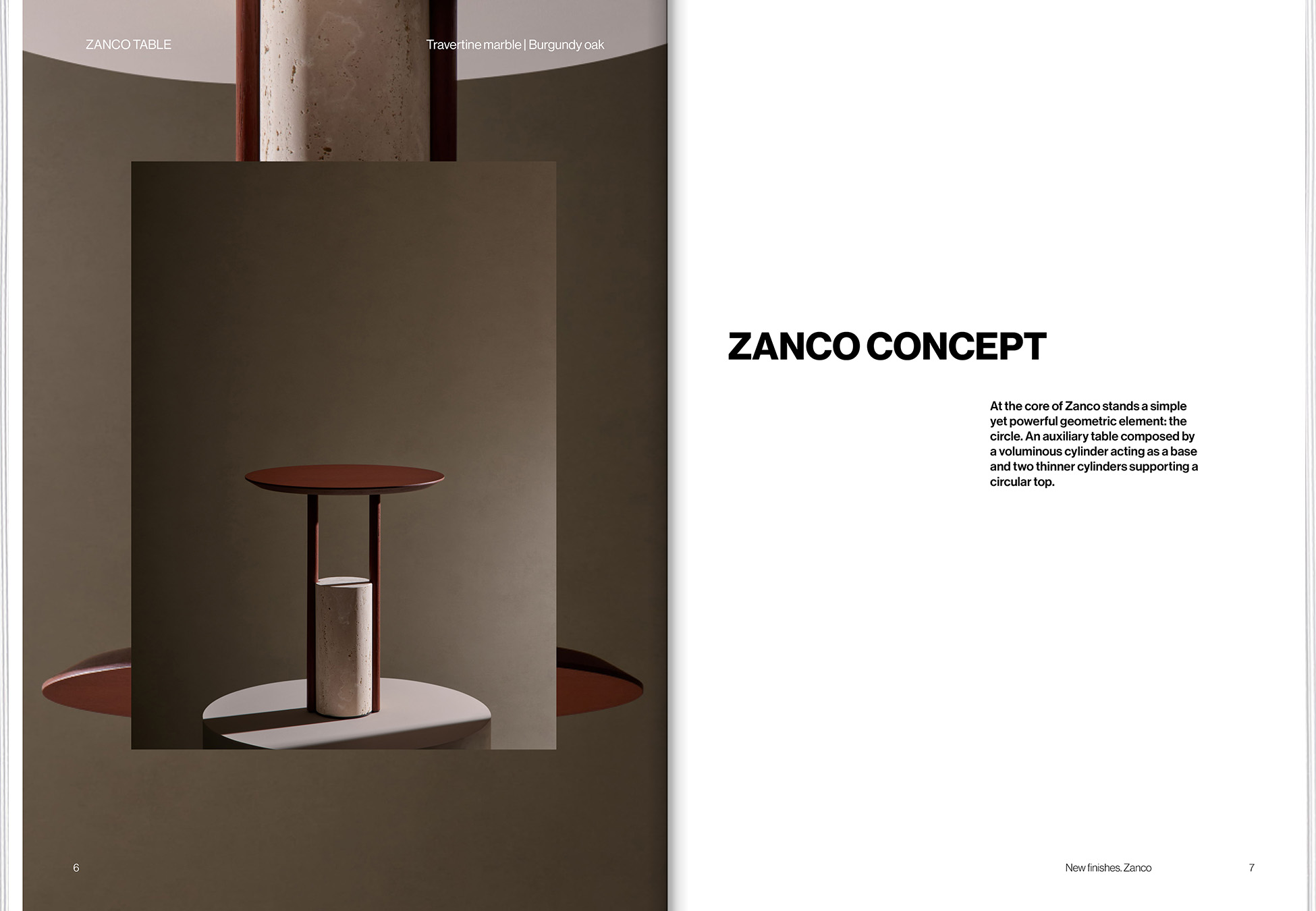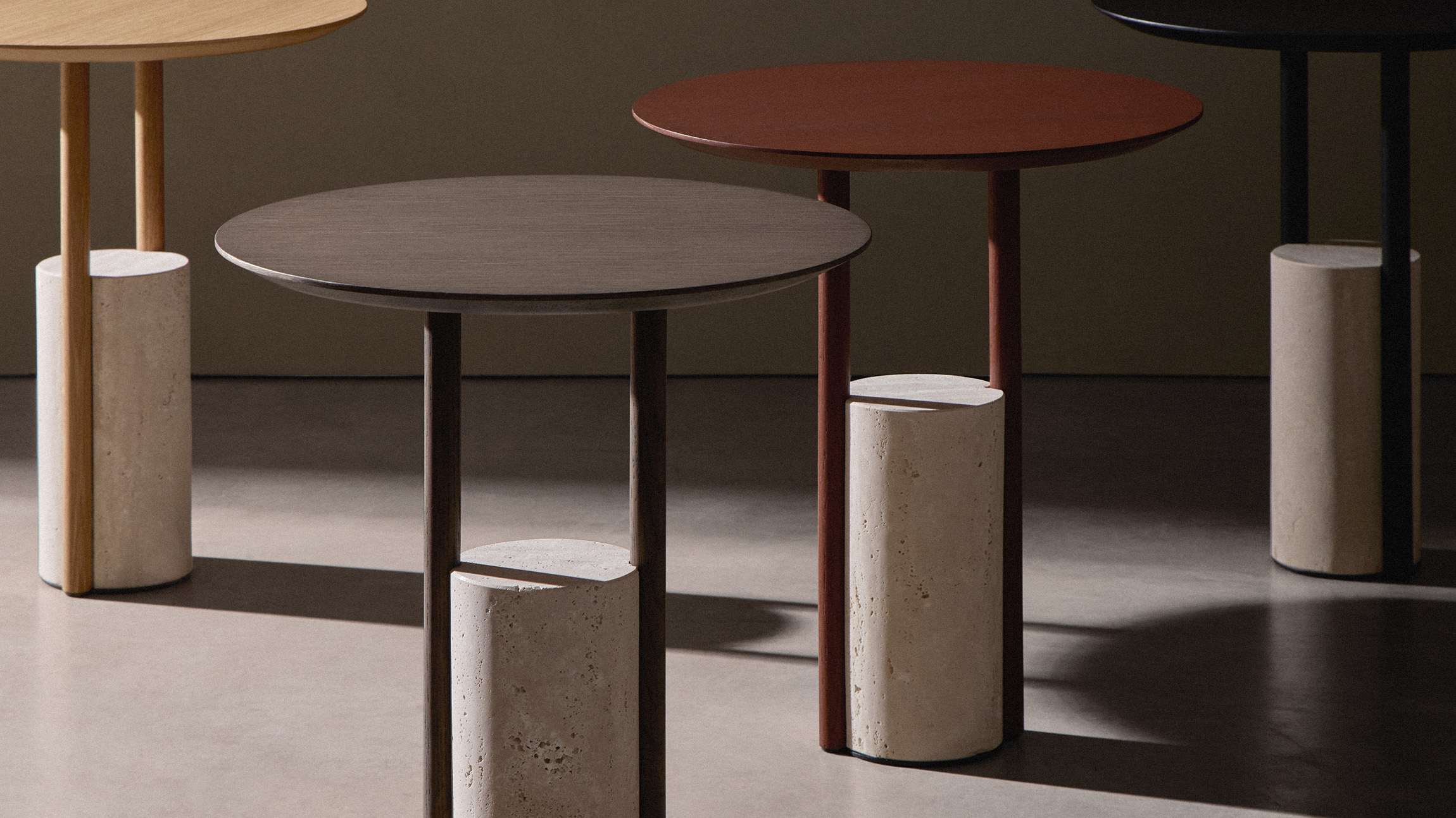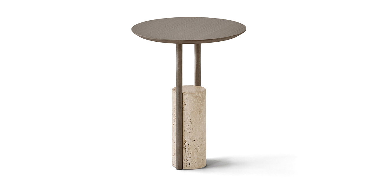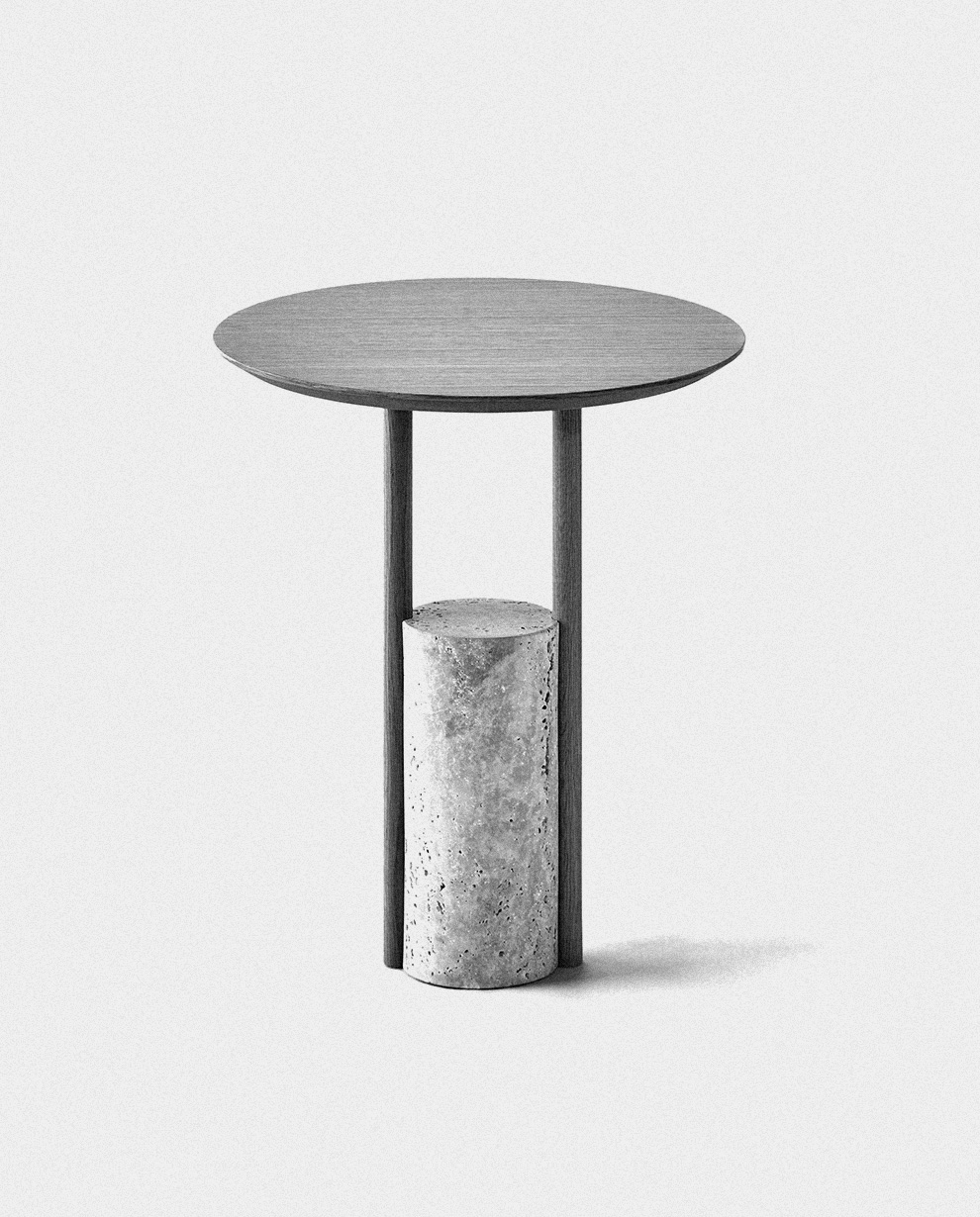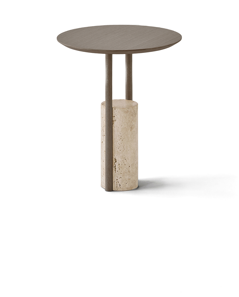 Zanco es una mesa auxiliar cuya estructura se compone de formas circulares puras: una base cilíndrica de mármol travertino que aporta solidez y carácter, y dos soportes estilizados en madera de roble que sostienen una tapa redonda, ligera y precisa.