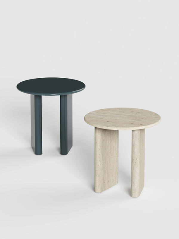 La colección ofrece versatilidad en acabados: además del mármol travertino, las mesas están disponibles en MDF lacado, lo que permite adaptar cada pieza a diferentes estilos y espacios, desde ambientes sofisticados y formales hasta interiores más contemporáneos y ligeros.