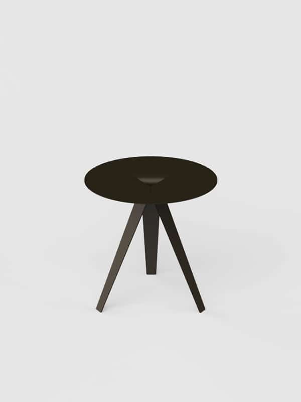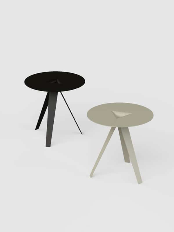Fabricada en metal termolacado microtexturado en negro o blanco, o en laca en cualquier color, esta mesa auxiliar ofrece una solución ligera, moderna y muy original, perfecta tanto para proyectos residenciales como para interiores contract que buscan un toque distintivo.