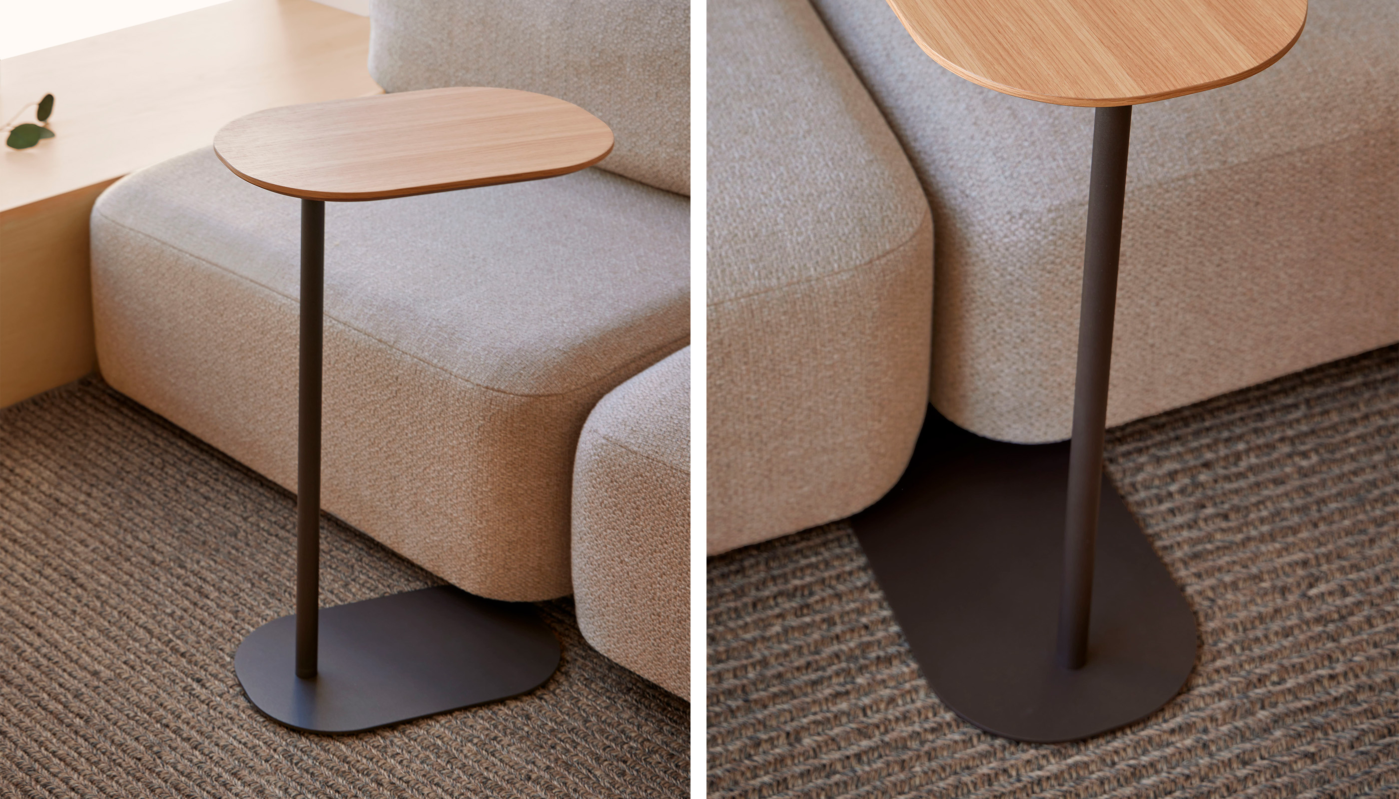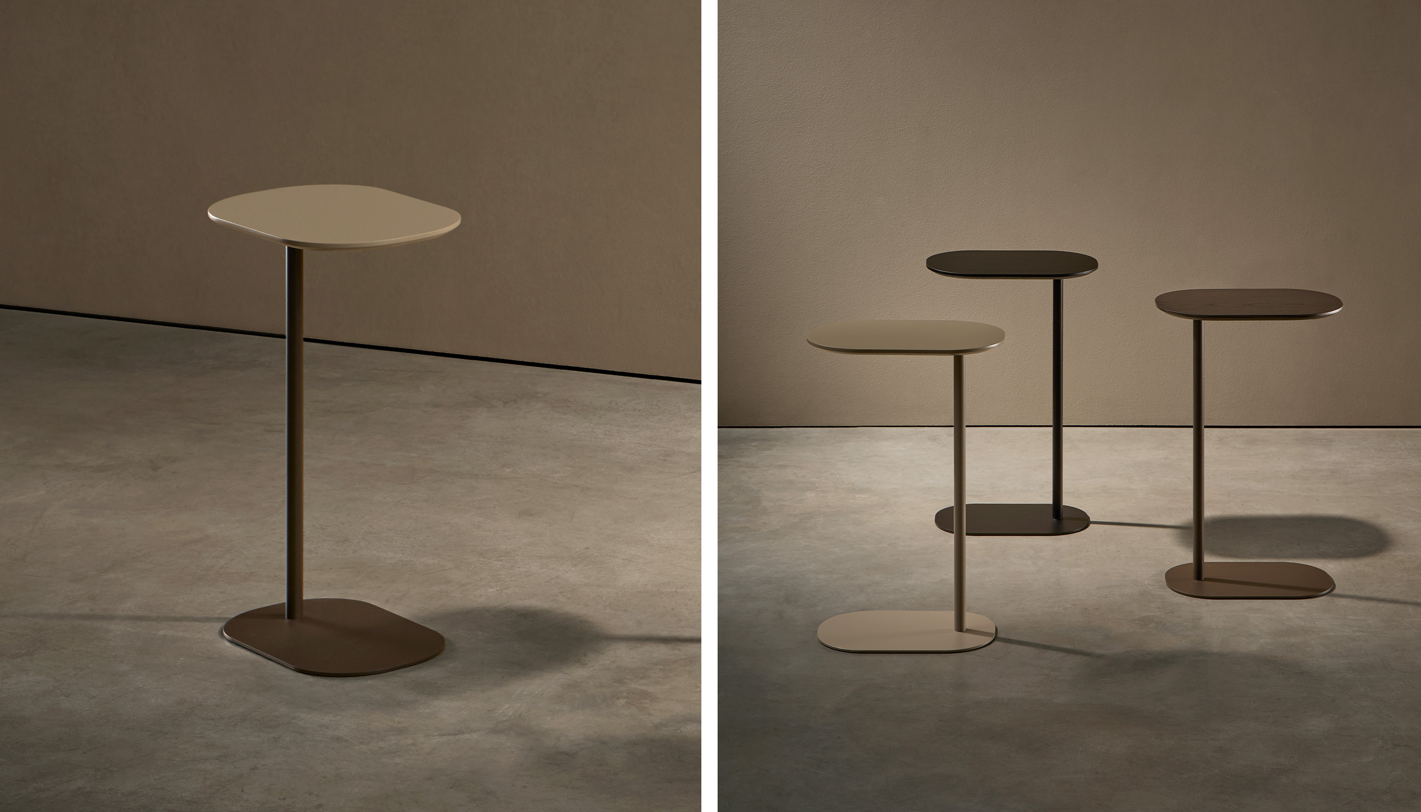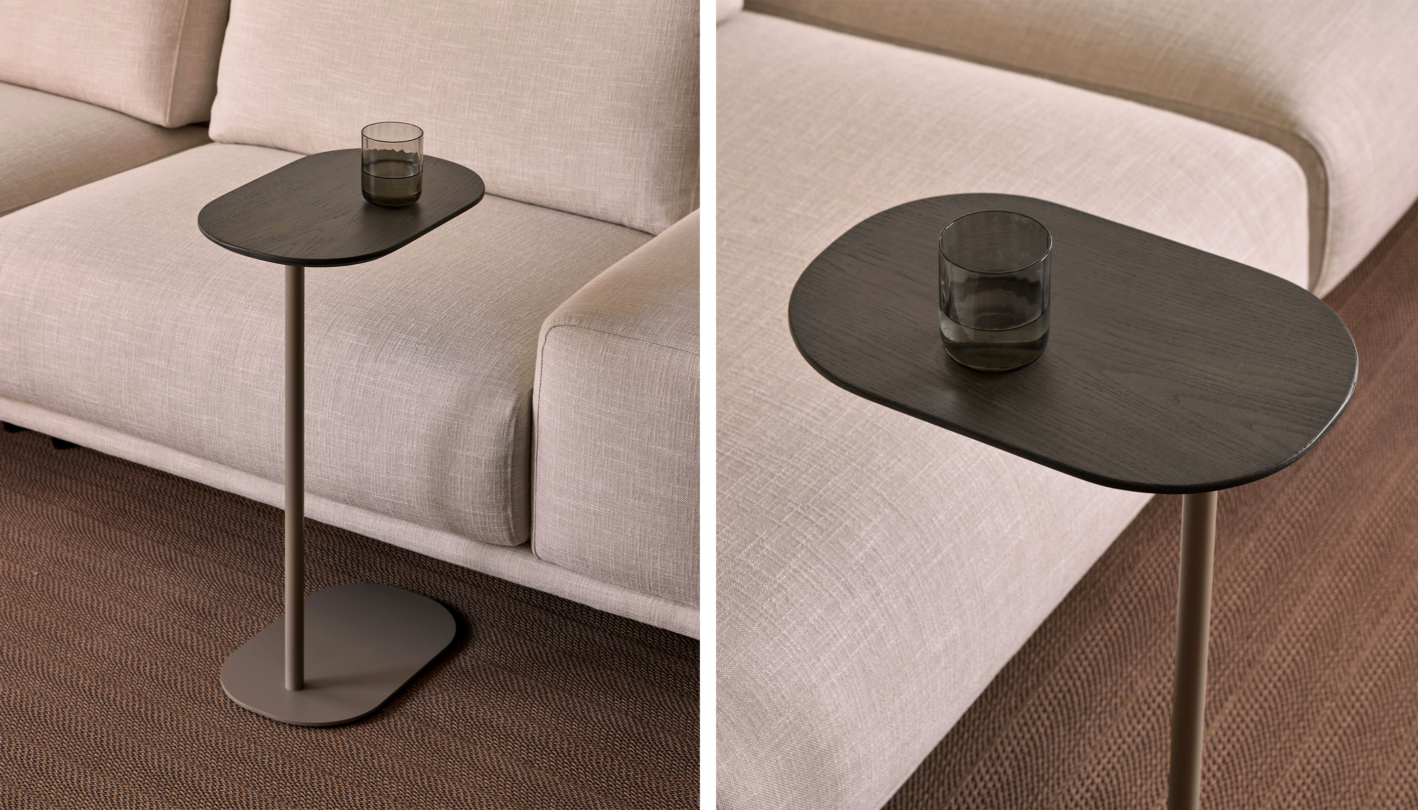 El diseño de la colección Une se articula alrededor de una fina columna que eleva el sobre, apoyada sobre una base amplia que garantiza estabilidad. Su peso ligero permite moverla con facilidad para acercarla a una butaca o sofá, ofreciendo una superficie práctica para apoyar objetos decorativos, un libro o incluso un ordenador portátil. Une funciona como un acompañante natural, adaptándose a las necesidades del día a día.