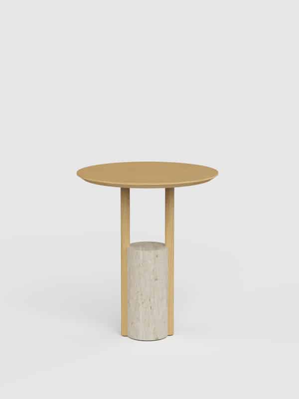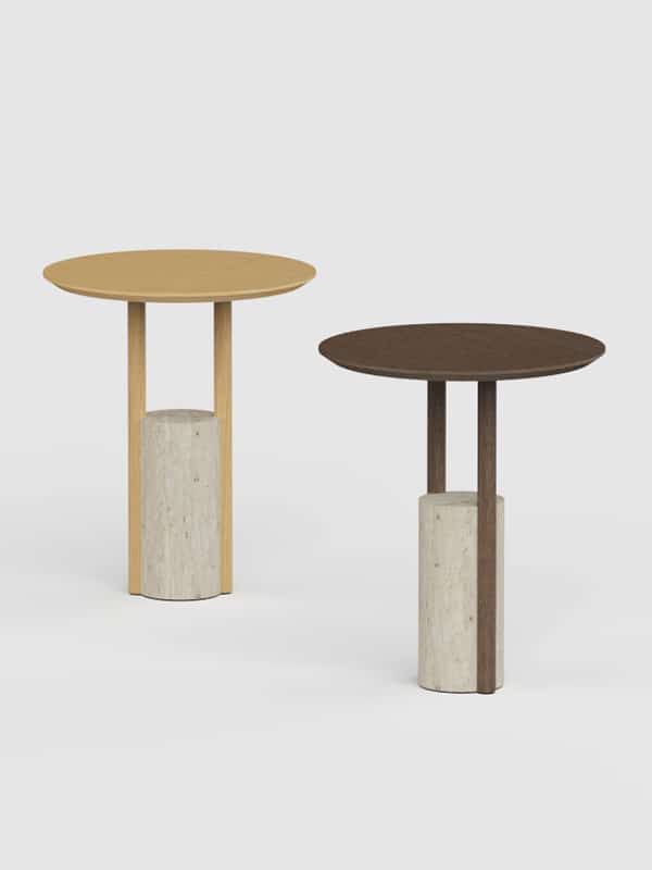 El diseño de Zanco juega con el contraste: por un lado, de materiales, combinando un bloque de mármol travertino en la base con soportes y tapa en roble, dos materiales naturales con propiedades y acabados distintos que aportan riqueza visual y táctil. Por otro lado, el contraste de proporciones entre la base volumétrica y la ligereza de los soportes y la tapa genera una estética equilibrada y armoniosa.