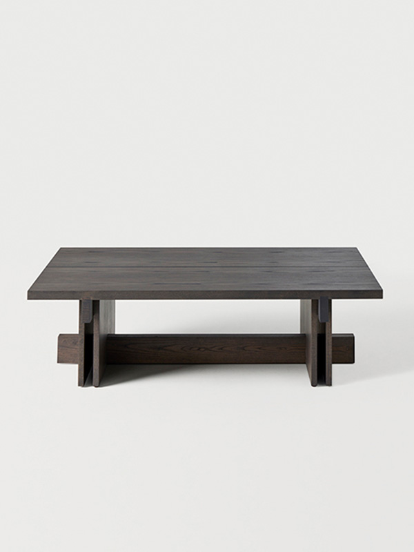 Los detalles revelan la intención del diseño: la tapa, disponible en forma redonda o cuadrada, está dividida en dos tablones con una separación entre ellos que aligera el conjunto, mientras que los travesaños estructurales refuerzan la estabilidad y enriquecen la lectura arquitectónica de la pieza. El espacio generado entre los laterales verticales crea una intersección visual que subraya la sensibilidad geométrica del conjunto.