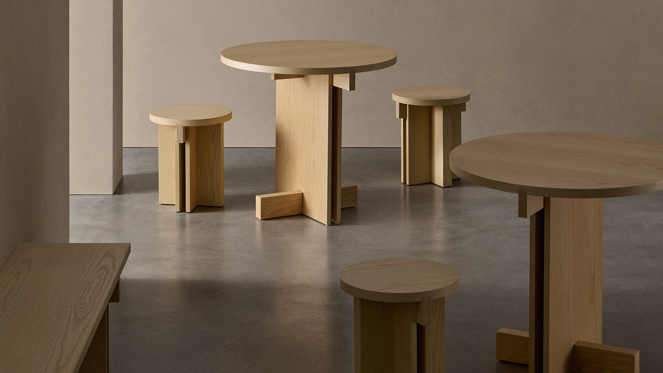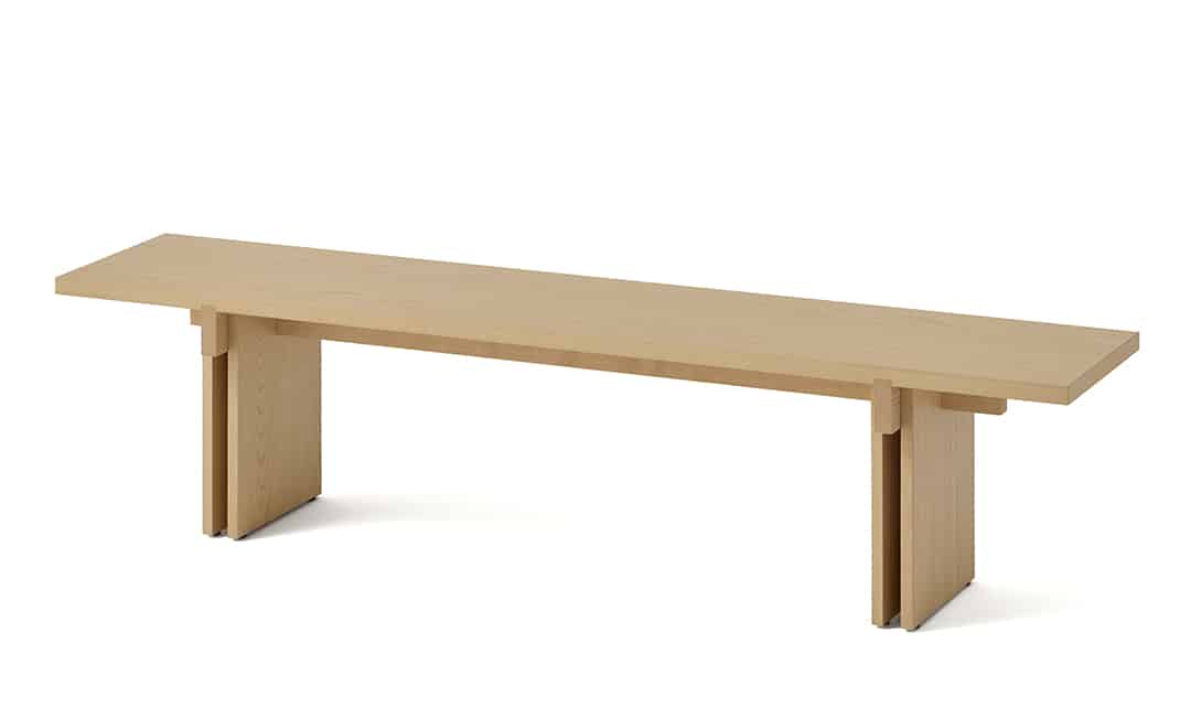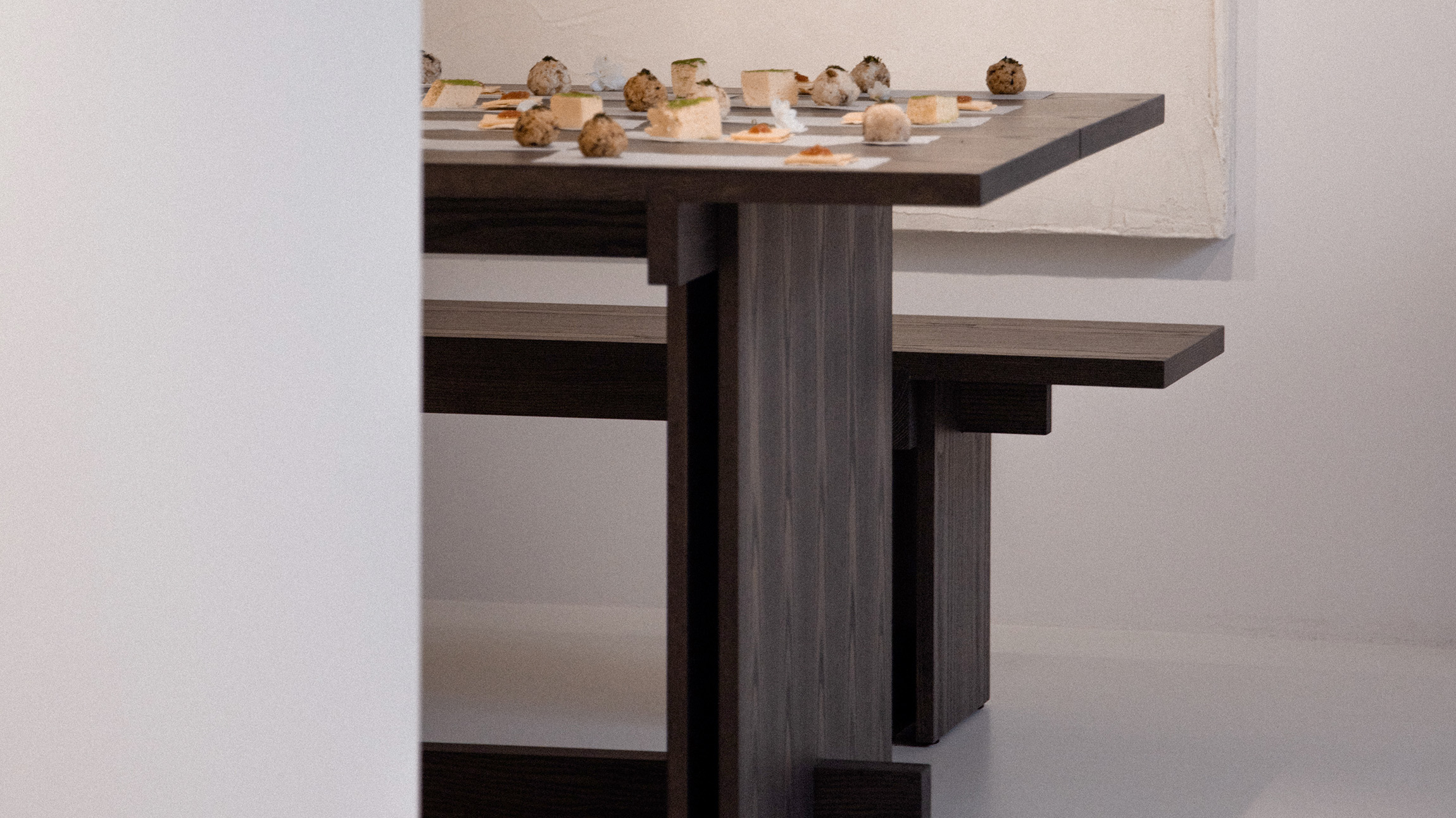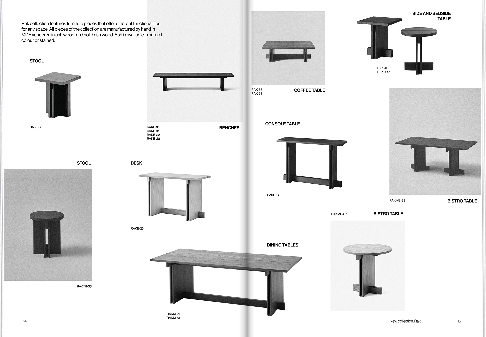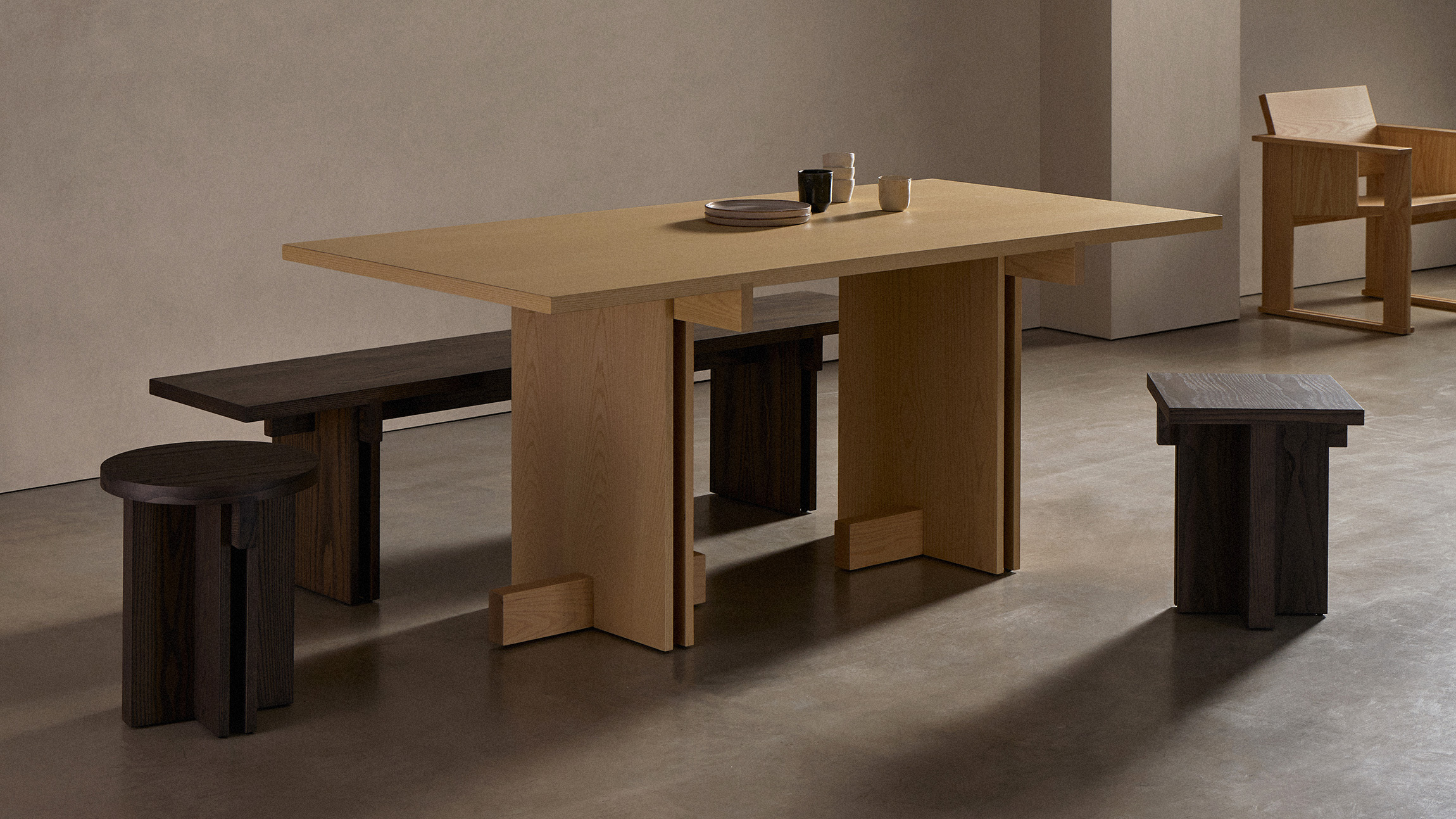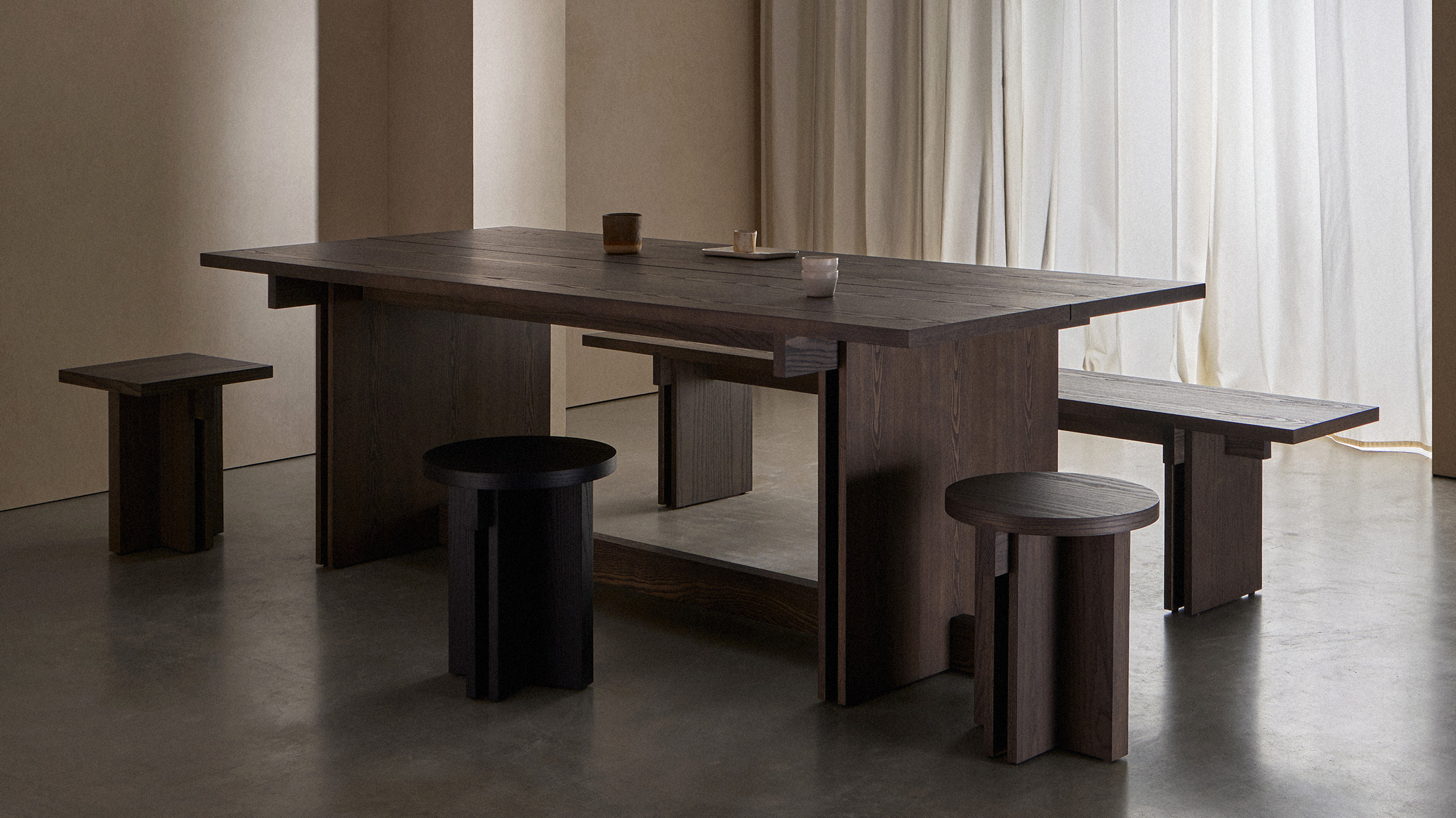 La mesa Rak establece el núcleo de la colección, acompañada junto a los bancos y taburetes forman un conjunto coherente. El resultado es un ambiente acogedor y sofisticado, donde cada pieza dialoga con las demás y se adapta tanto a espacios domésticos como contract.