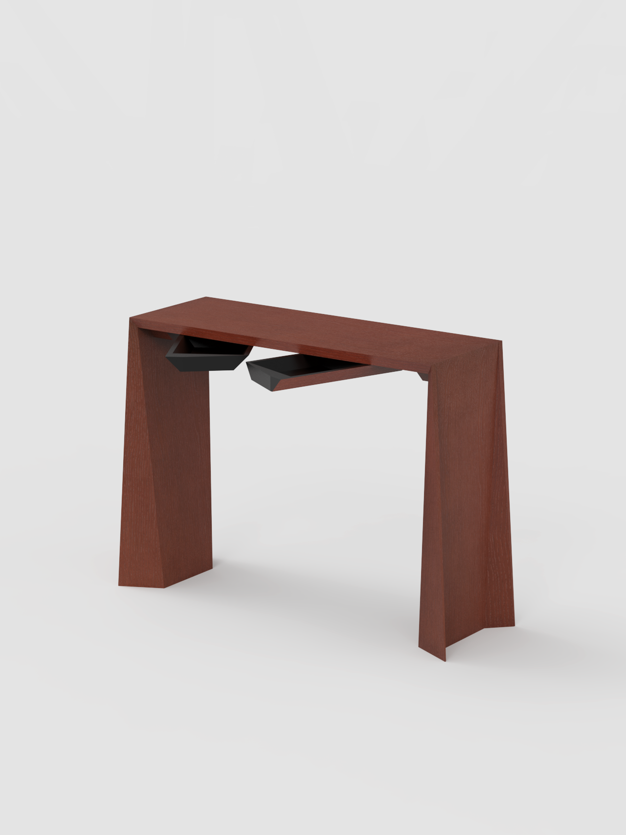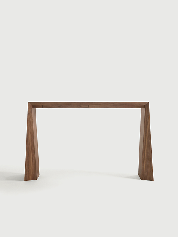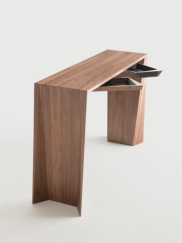 La consola Naruk está disponible en dos medidas, lo que permite una adaptación precisa a distintos tipos de estancia. Además, ofrece la posibilidad de incorporar dos bandejas giratorias ocultas bajo la tapa, un detalle funcional que mejora la experiencia de uso sin alterar la limpieza formal del diseño.