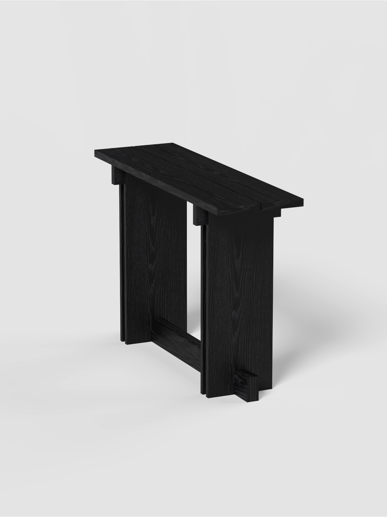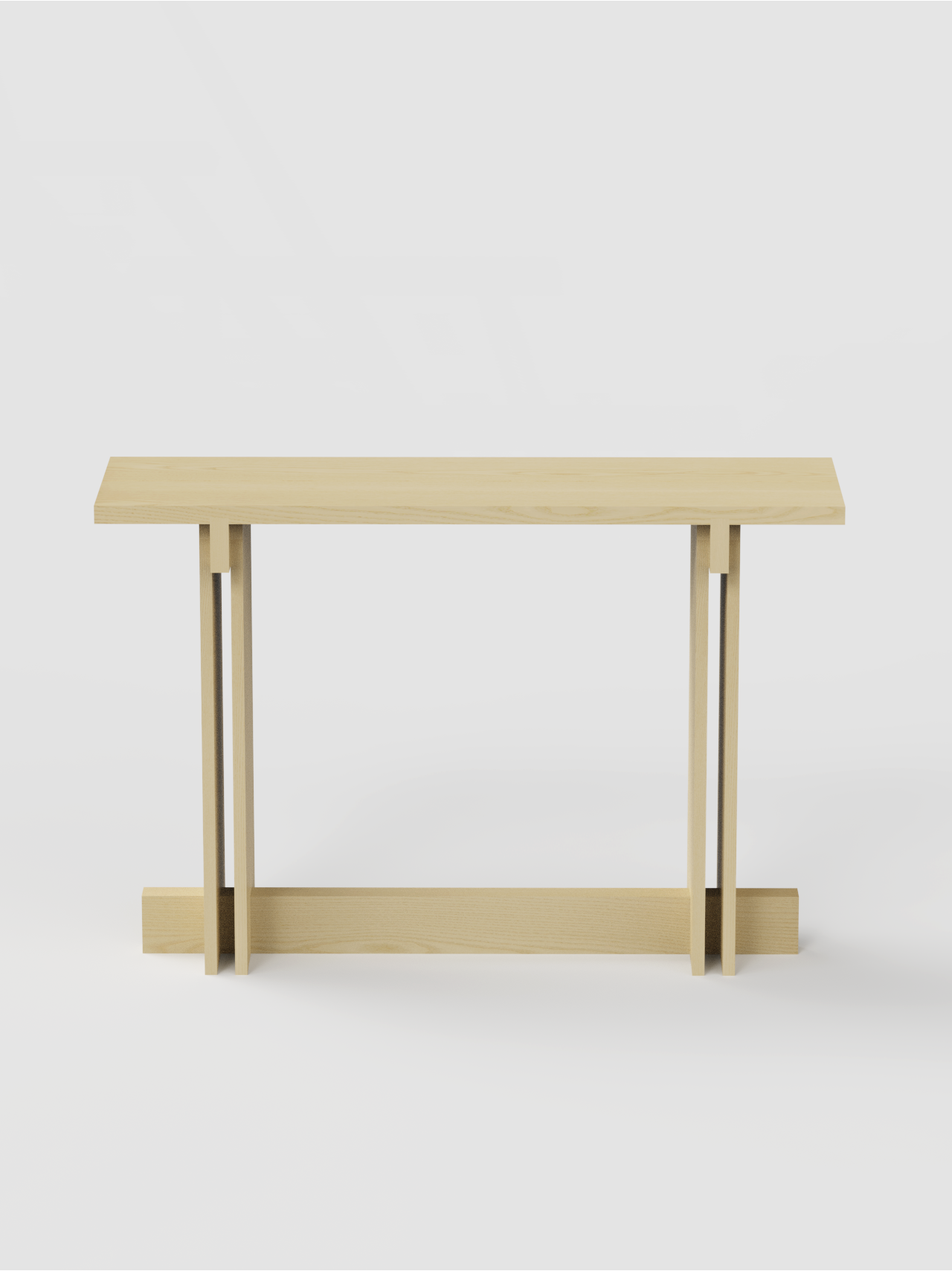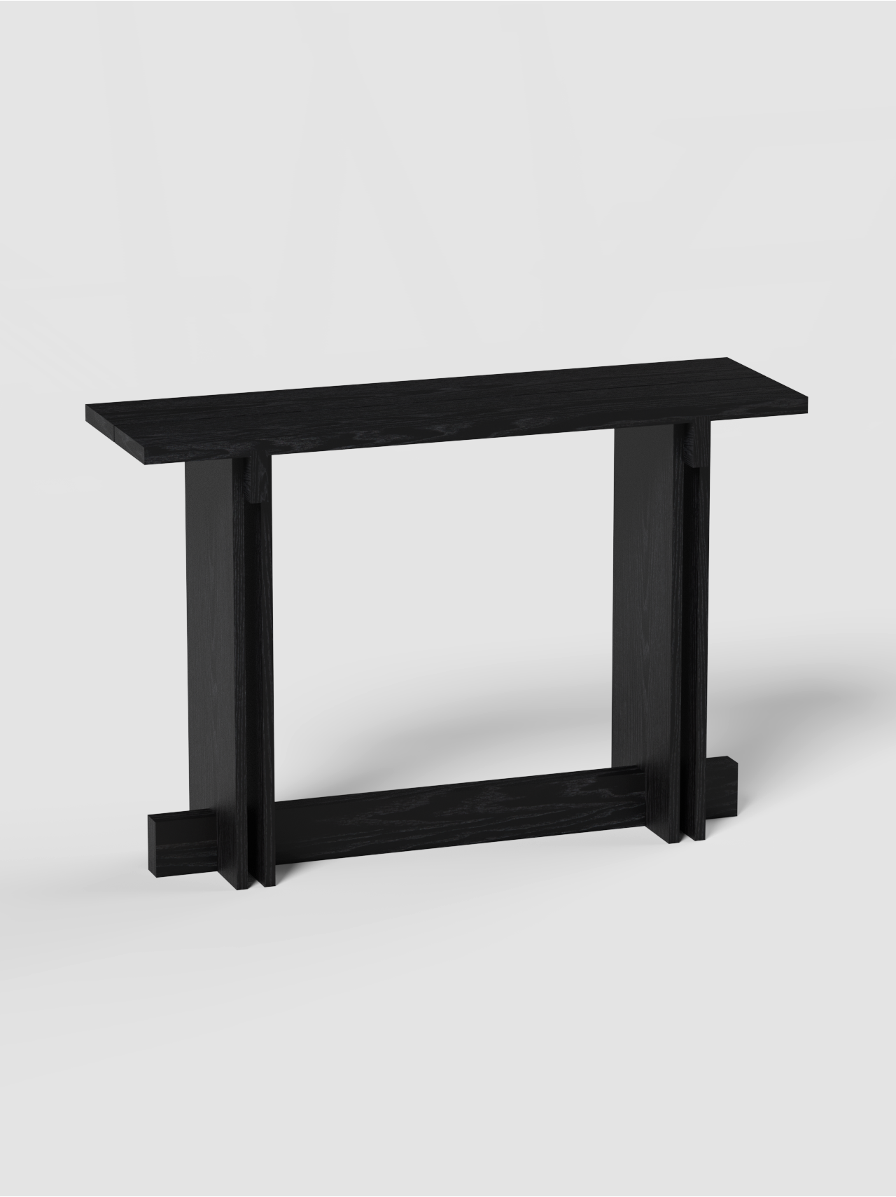 La consola se distingue por la división de la tapa en dos tablones, que aporta ligereza visual, y por los travesaños estructurales, que refuerzan la estabilidad y realzan la lectura arquitectónica del mueble. El espacio entre los laterales verticales crea una intersección visual que subraya la sensibilidad geométrica de la pieza, convirtiéndola en un elemento sofisticado y versátil para hogares y proyectos contract.