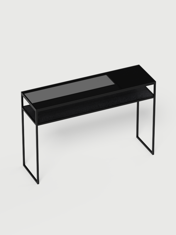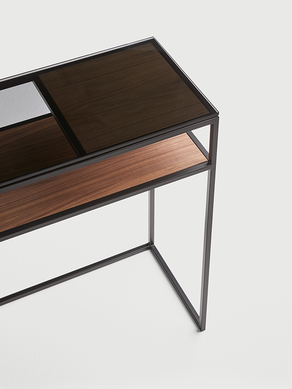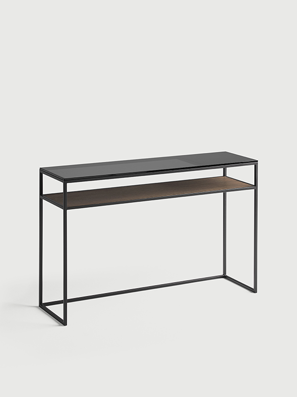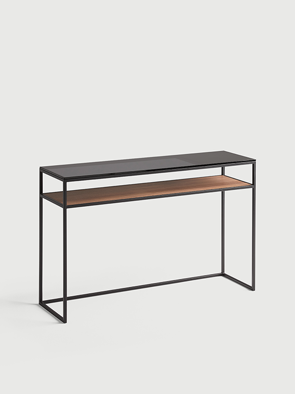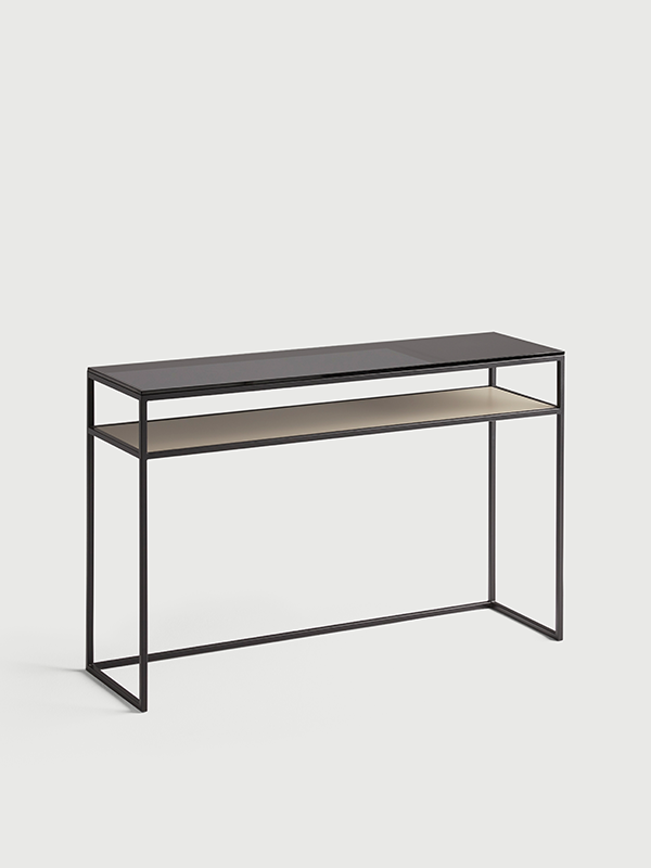 Cada consola combina una estructura metálica termolacada en negro microtexturado con una base personalizable en laca, roble o nogal, adaptándose a estilos que van desde la sobriedad elegante hasta propuestas más cálidas y expresivas. El diseño se completa con un sobre de cristal fumé gris, que aporta profundidad y sofisticación, convirtiendo la consola Rita en una pieza funcional y decorativa capaz de elevar cualquier espacio.