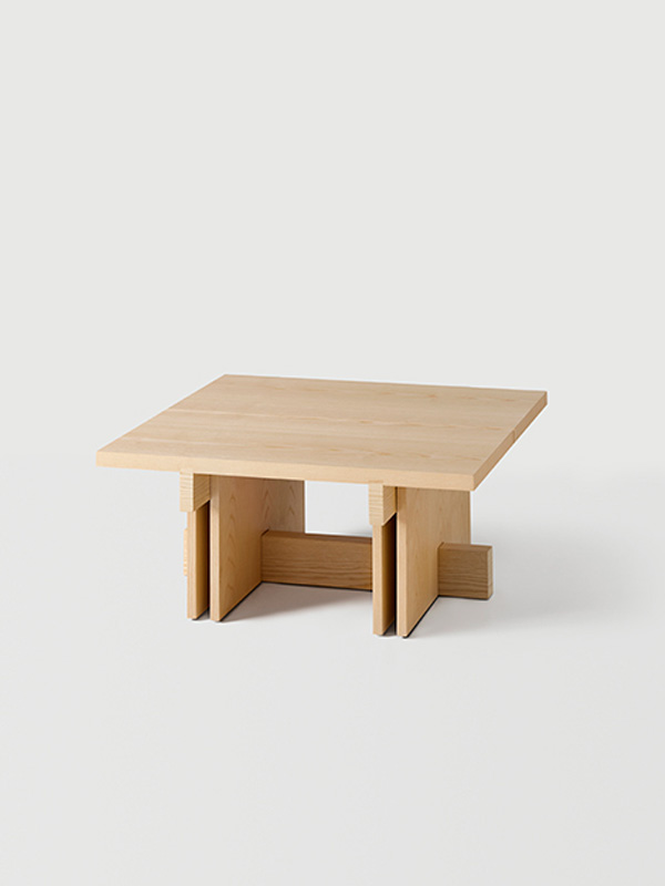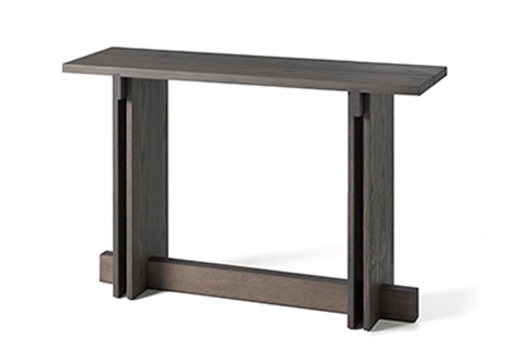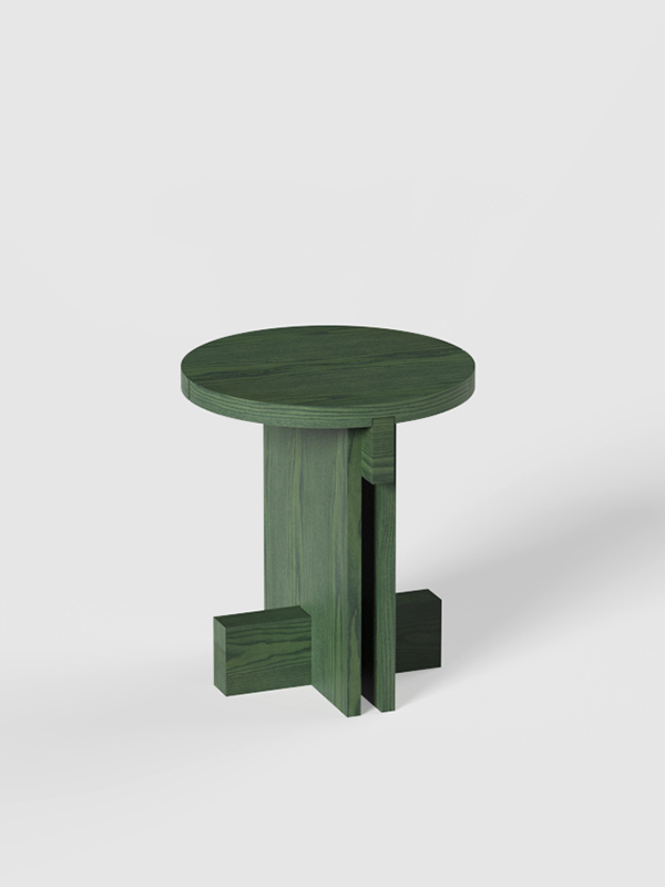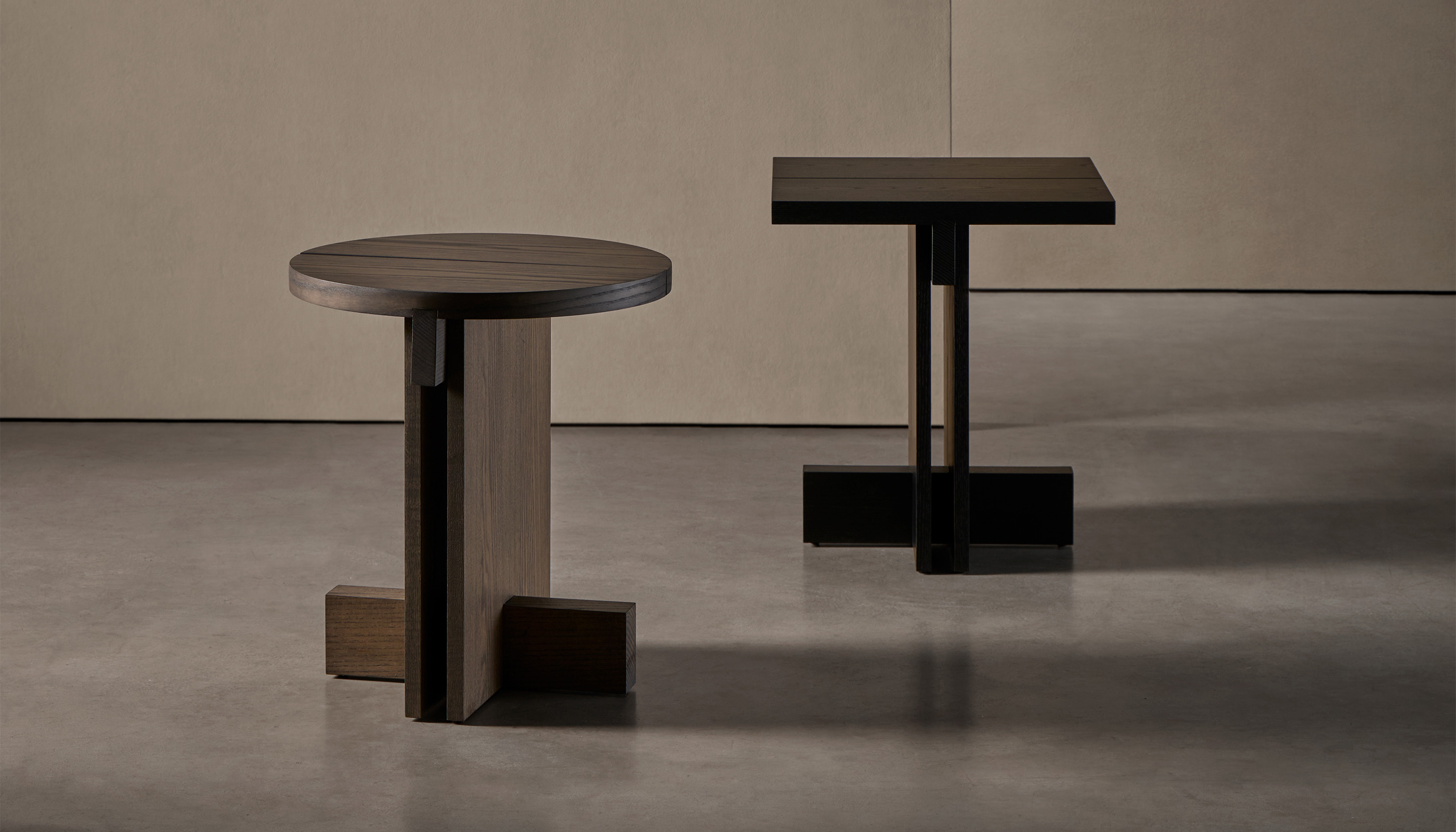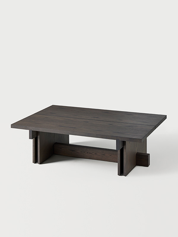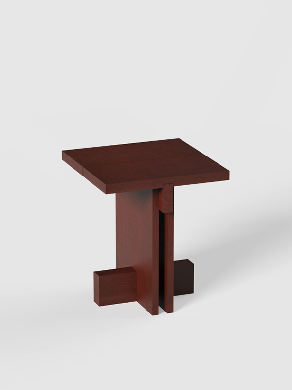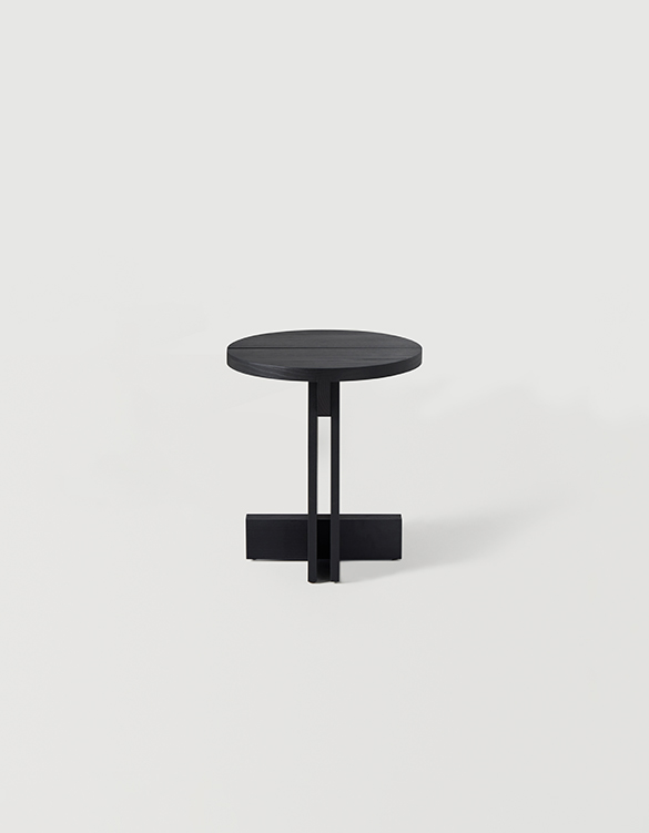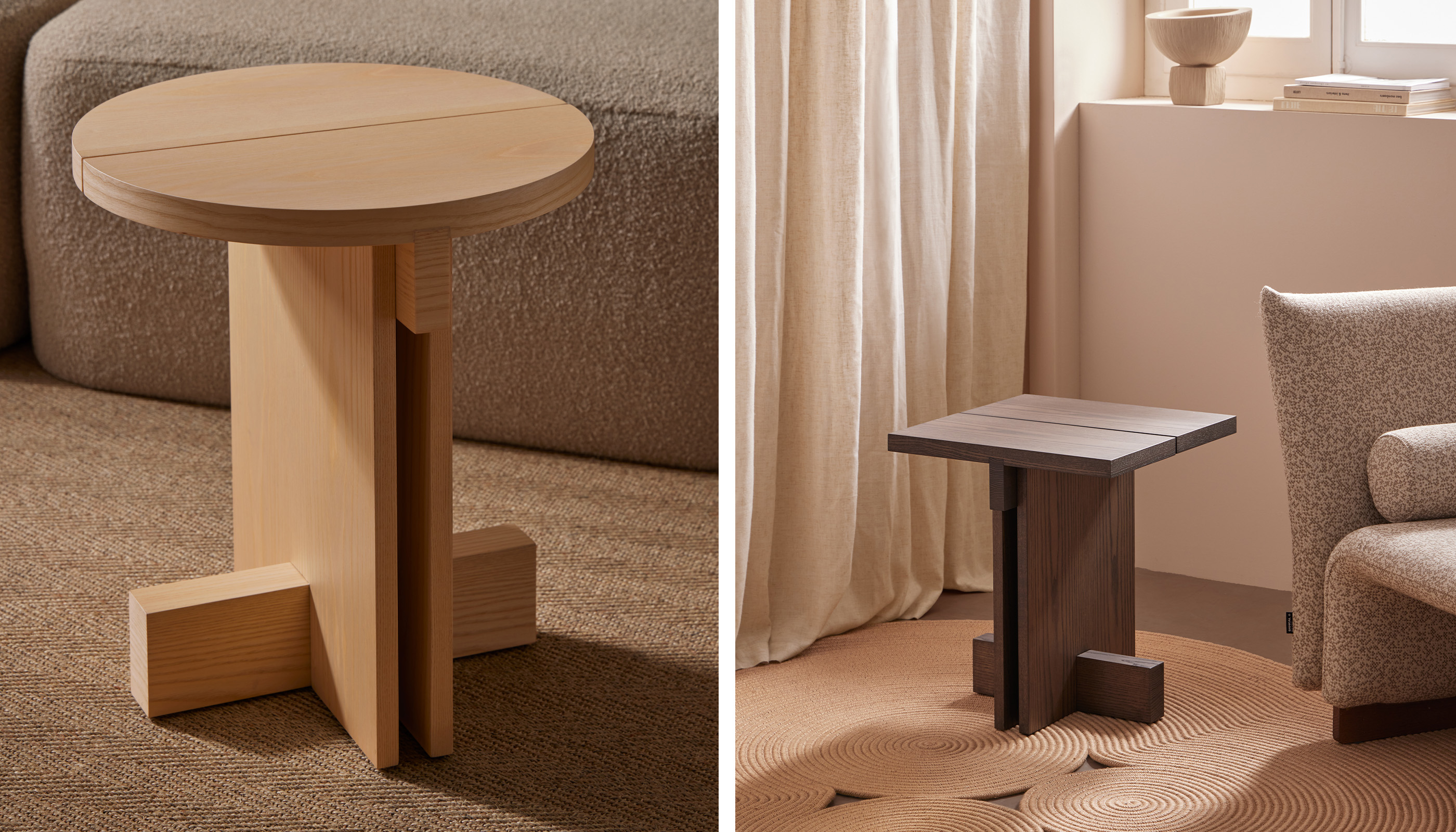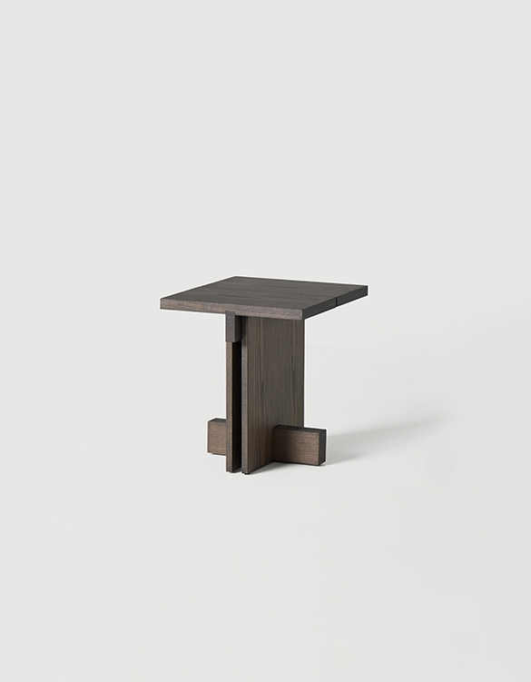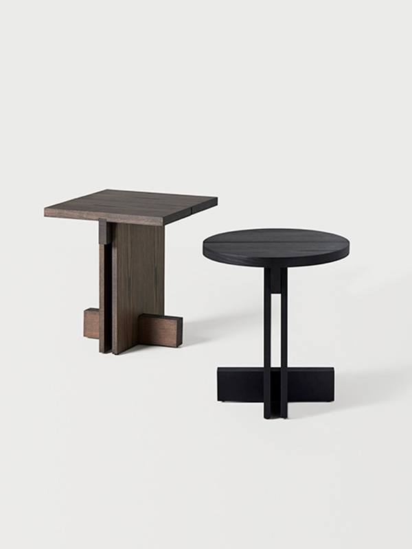 Los detalles revelan la intención del diseño: la tapa, disponible en forma redonda o cuadrada, está dividida en dos tablones con una separación entre ellos que aligera el conjunto, mientras que los travesaños estructurales refuerzan la estabilidad y enriquecen la lectura arquitectónica de la pieza. El espacio generado entre los laterales verticales crea una intersección visual que subraya la sensibilidad geométrica del conjunto.