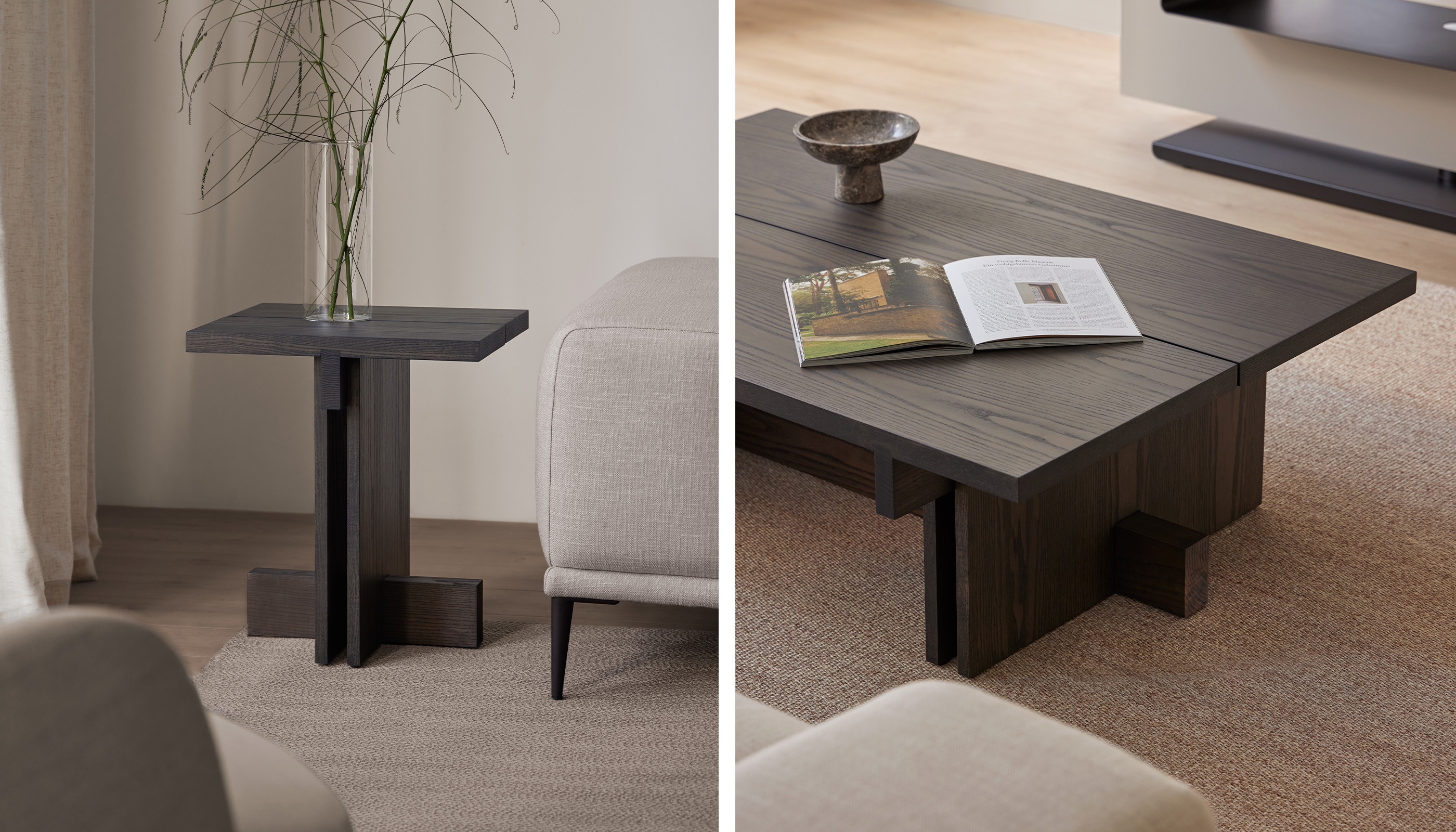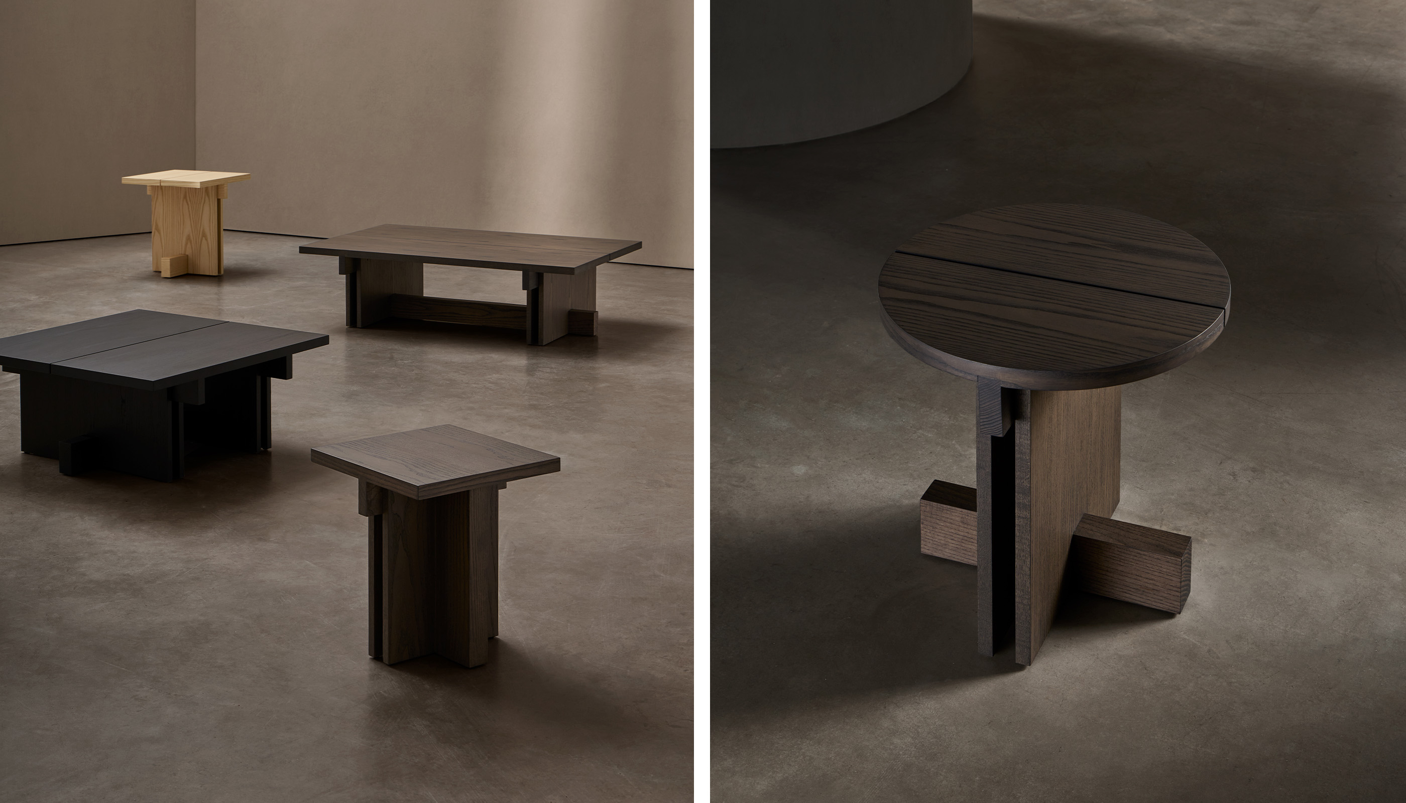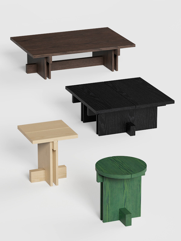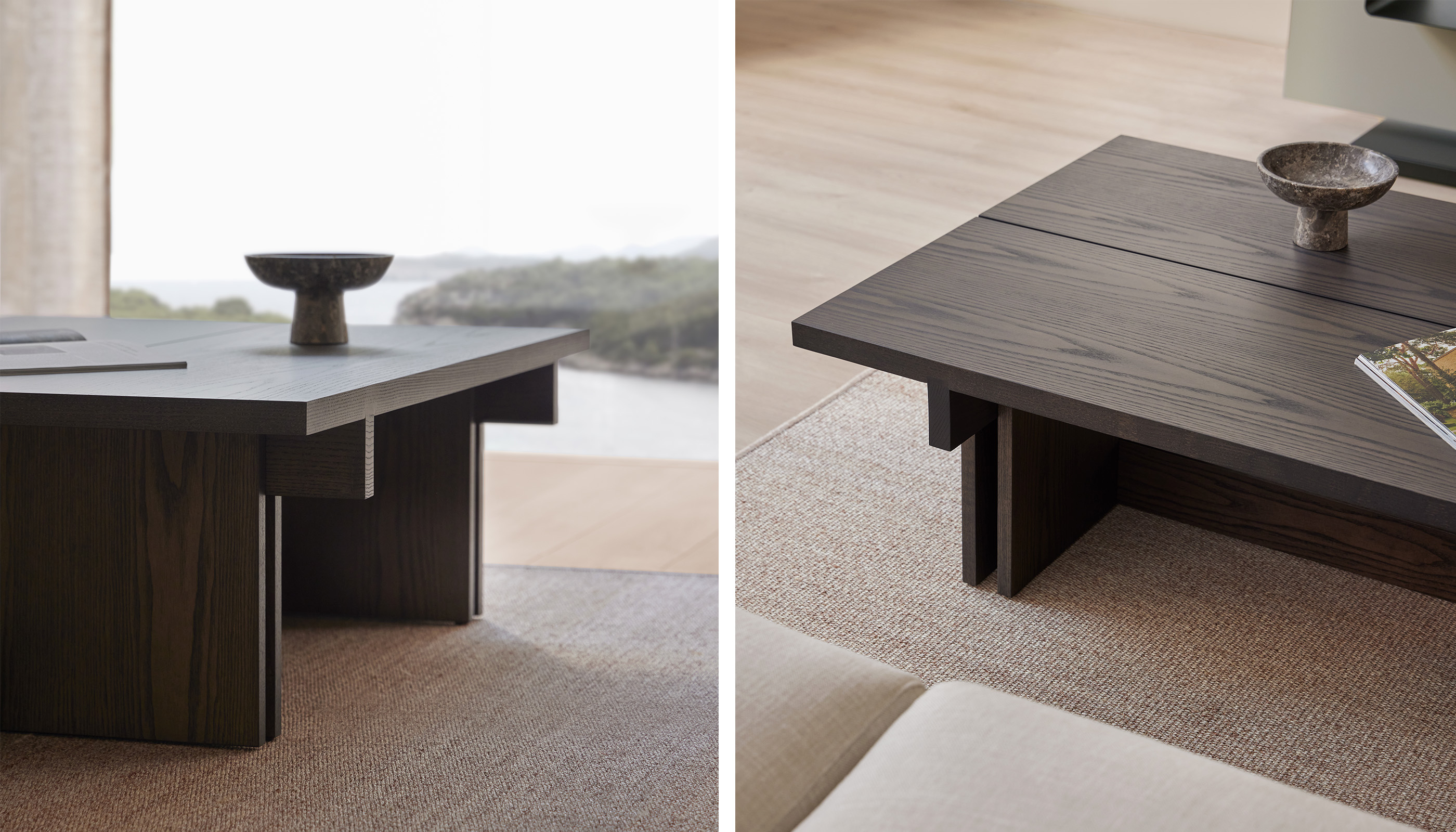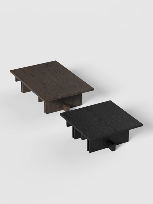 Cada mesa de la colección es el resultado de un minucioso trabajo de ensamblaje, donde cada elemento encaja con exactitud para conseguir una armonía visual impecable. Aunque sus formas son sólidas y contundentes, el conjunto transmite una elegancia equilibrada y atemporal.