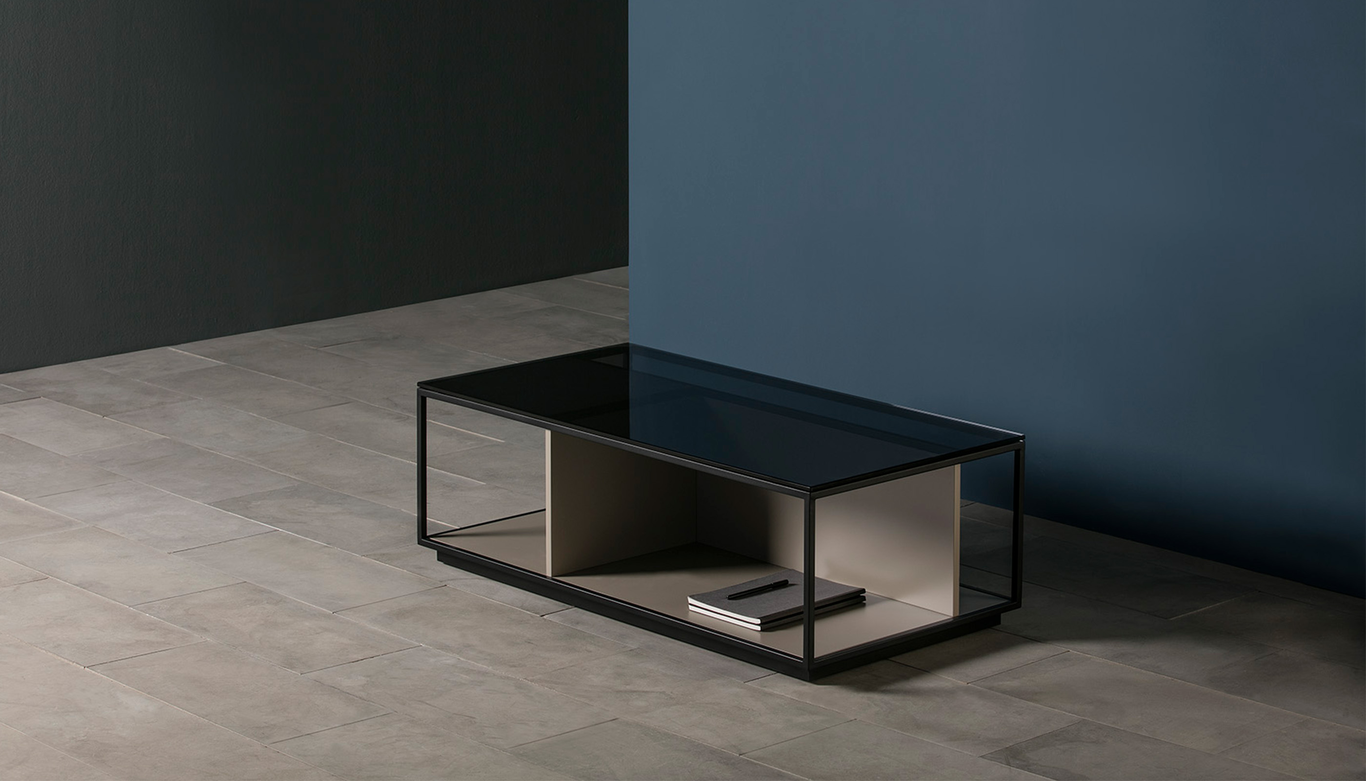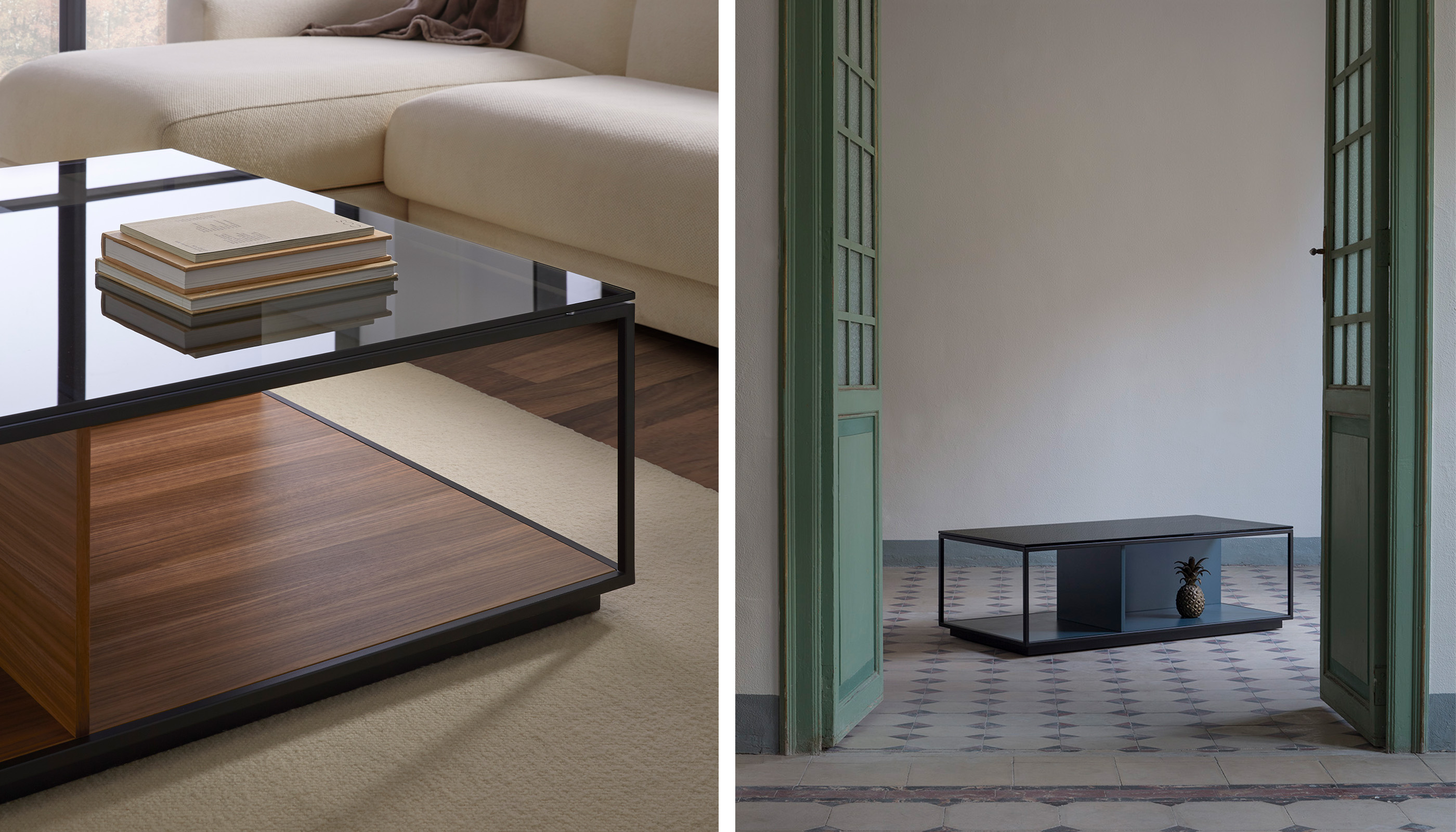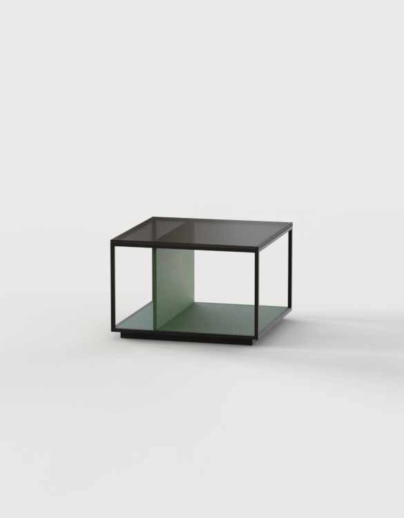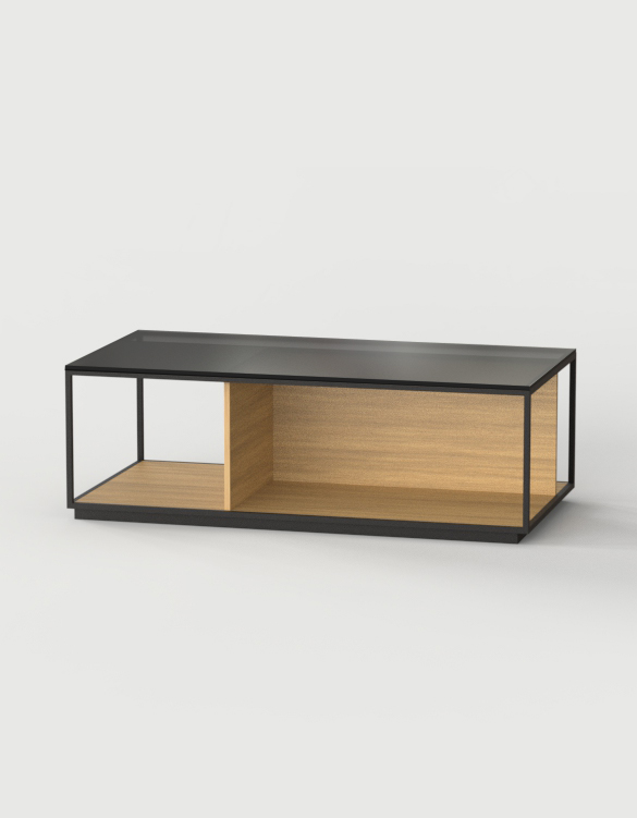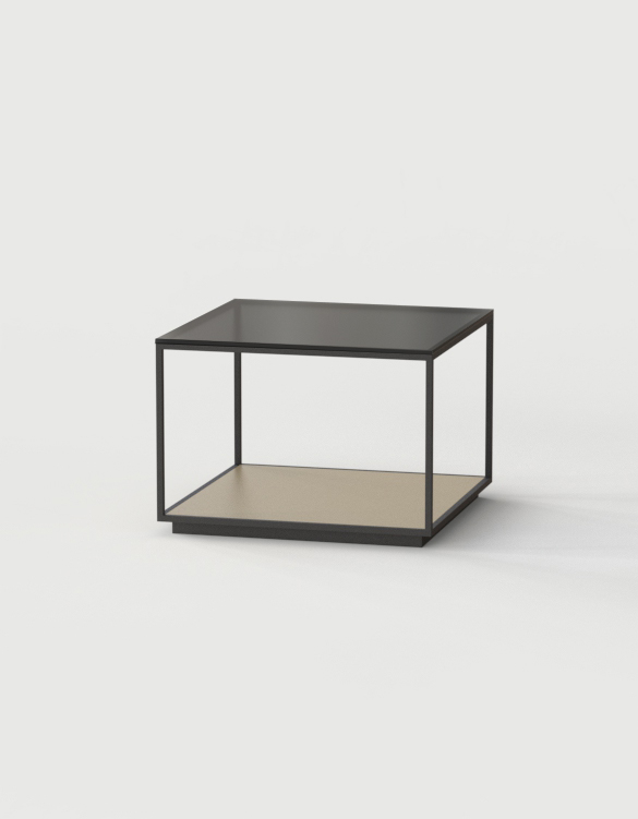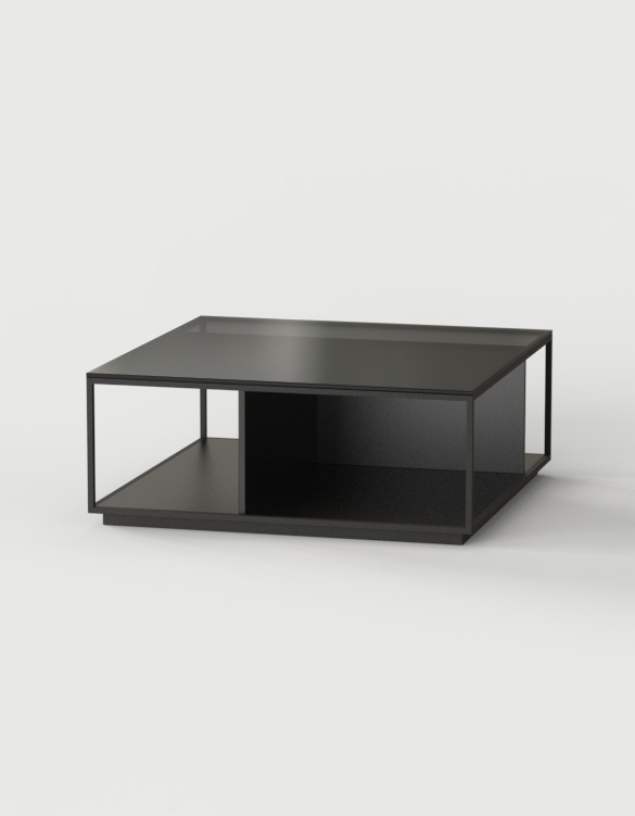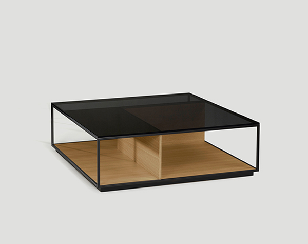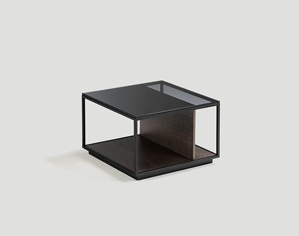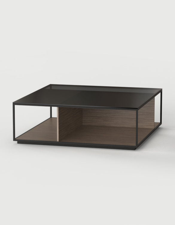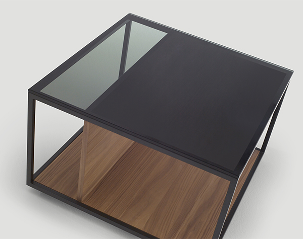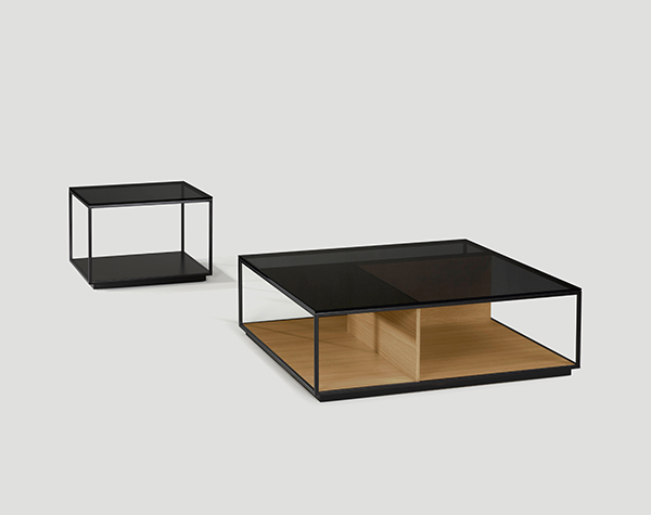 Las mesas están compuestas por una estructura metálica termolacada en negro microtexturado, por una base y unos costados verticales, los cuales pueden personalizarse tanto en laca, como nogal o roble, y por un sobre de cristal fumé gris.